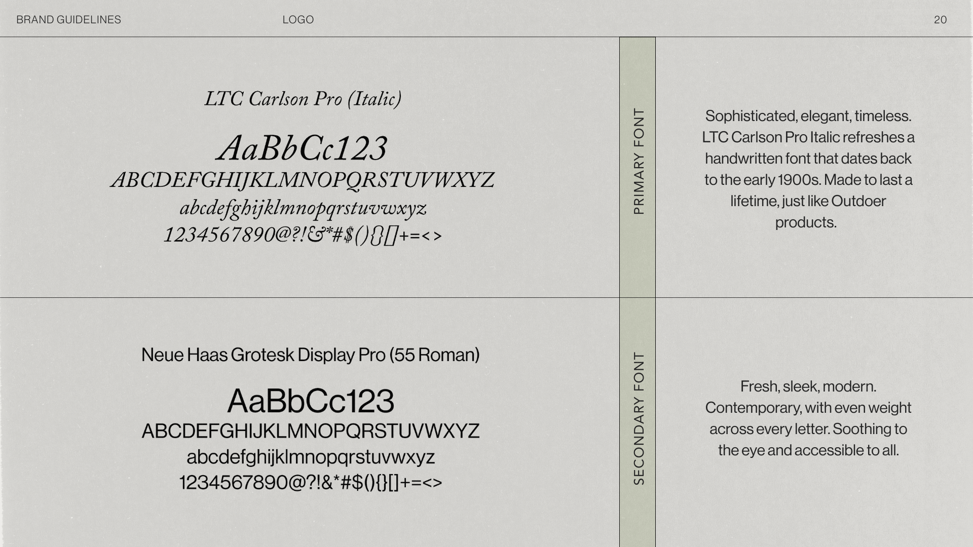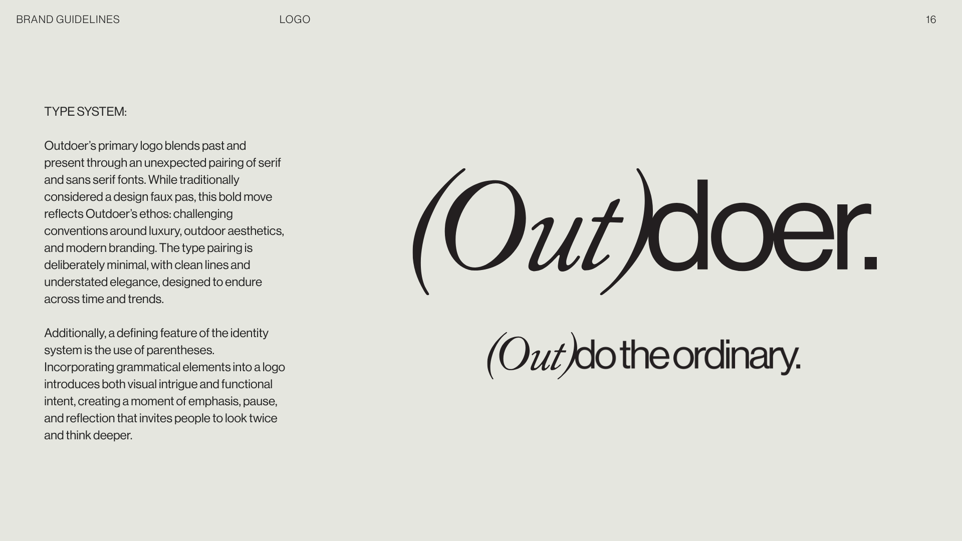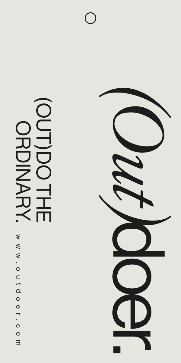 A deliberately unconventional typographic pairing: italic serif and clean sans serif, reflecting Outdoer's core ethos: past and present, heritage and modernity, warmth and precision. The logo is a small provocation. It asks you to look twice.