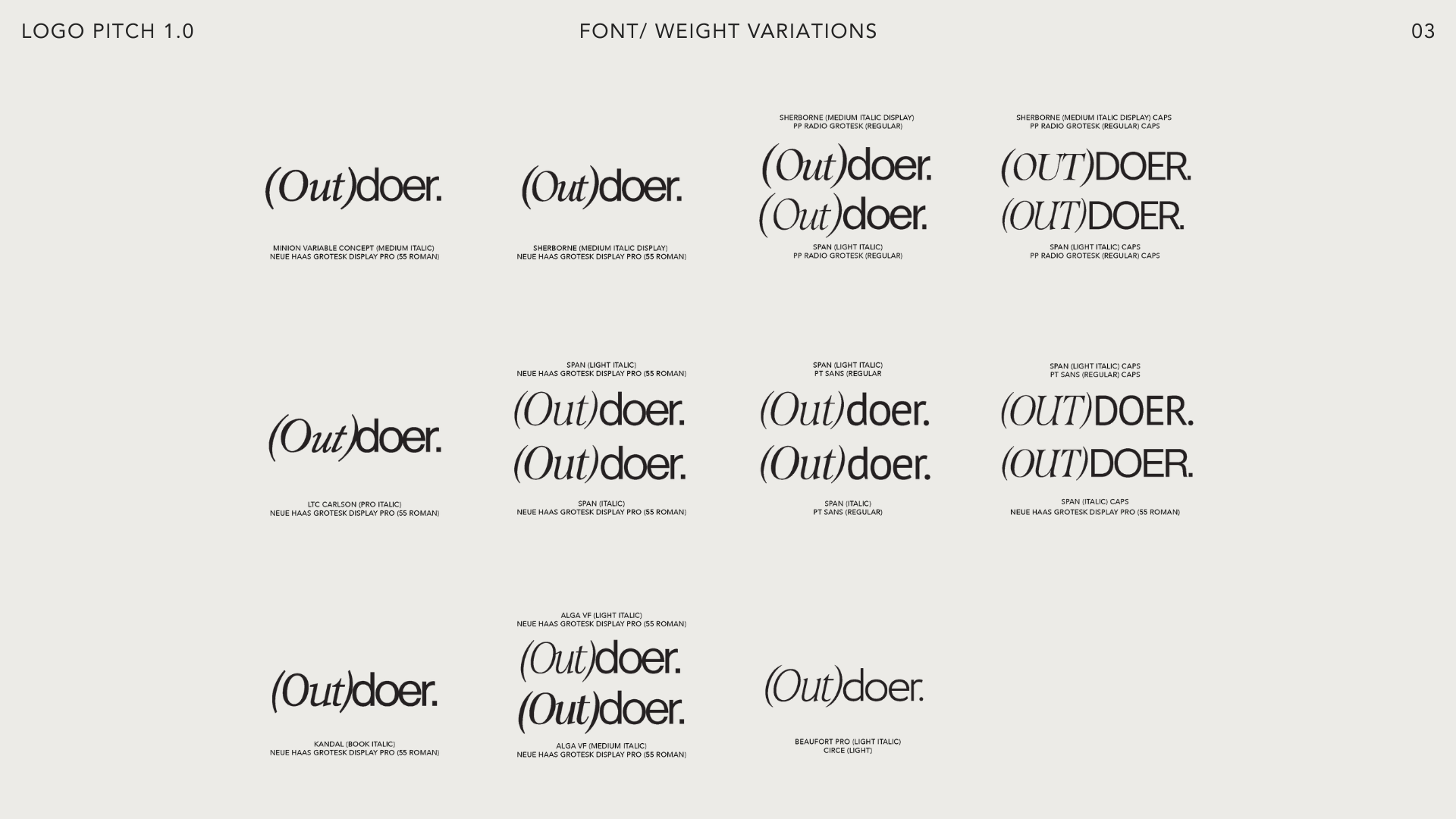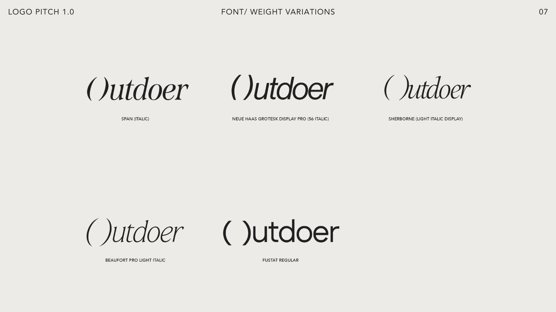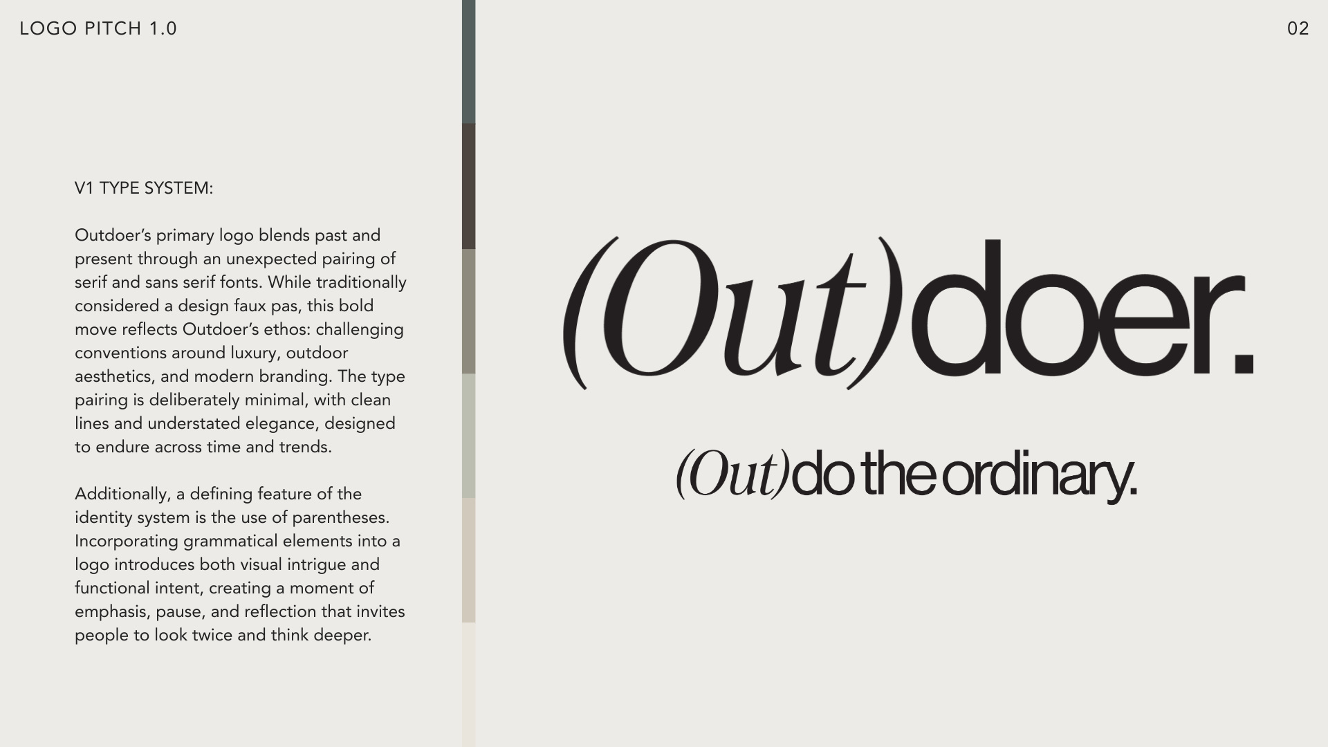 A deliberately unconventional typographic pairing: italic serif and clean sans serif, reflecting Outdoer's core ethos: past and present, heritage and modernity, warmth and precision. The logo is a small provocation. It asks you to look twice.