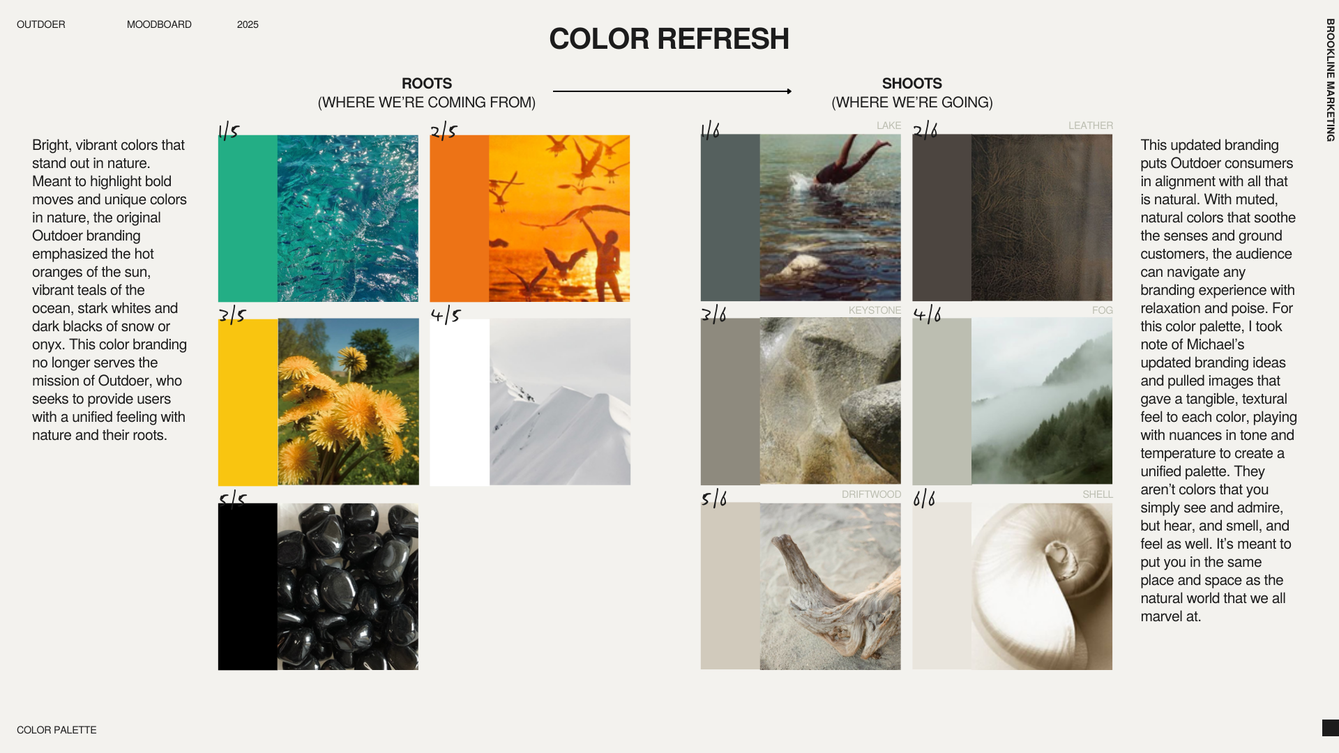 That's where the moodboards began. Because Outdoer's differentiator was never just product, it was a feeling, a way of moving through the world, I made the decision to lead with narrative in tandem with imagery. Each moodboard was paired with a written piece: a short, atmospheric story that gave language to the mood, the emotion, the kind of person who would live inside this brand. The visuals and the words made the abstract concrete, and gave the client something to react to beyond pixels and color swatches.
