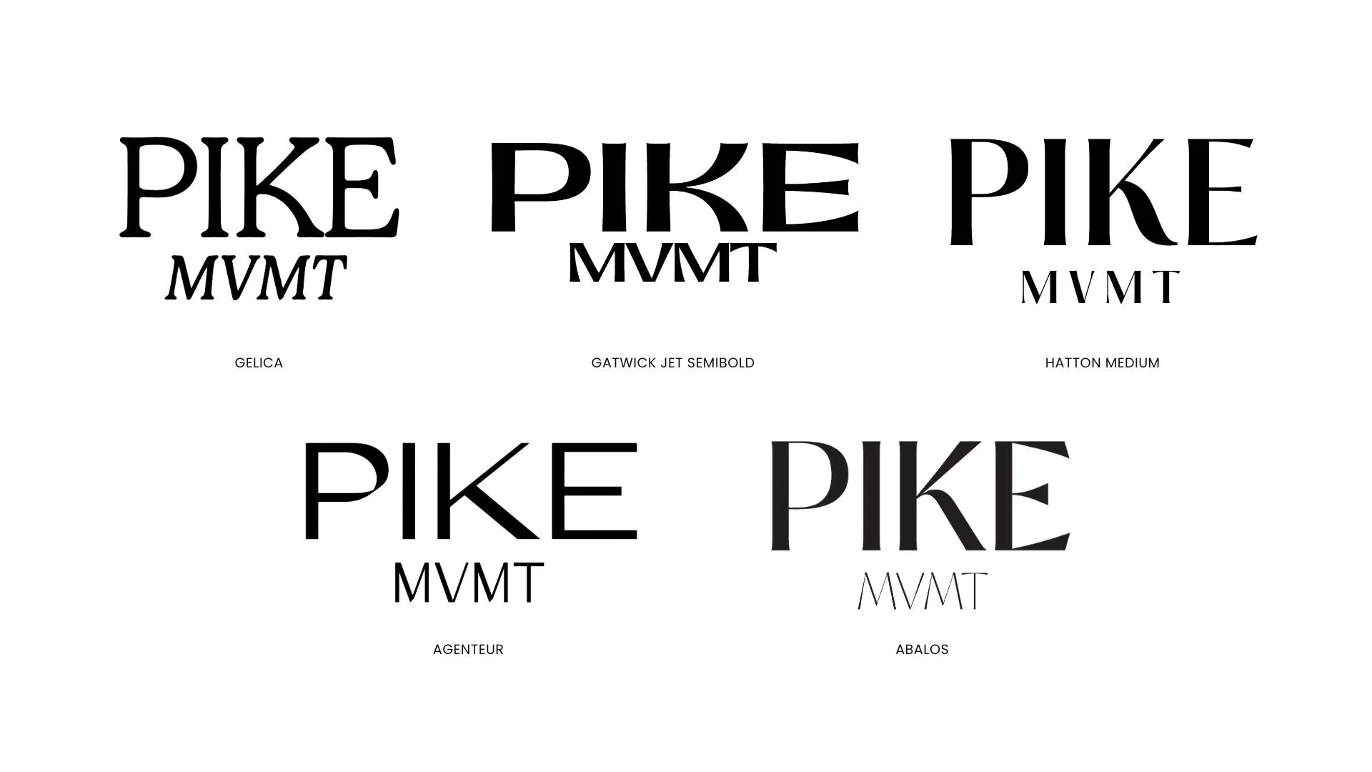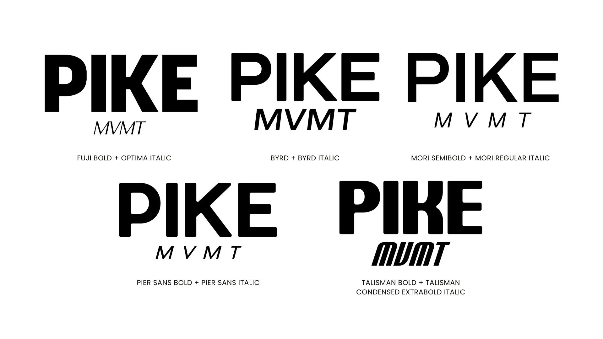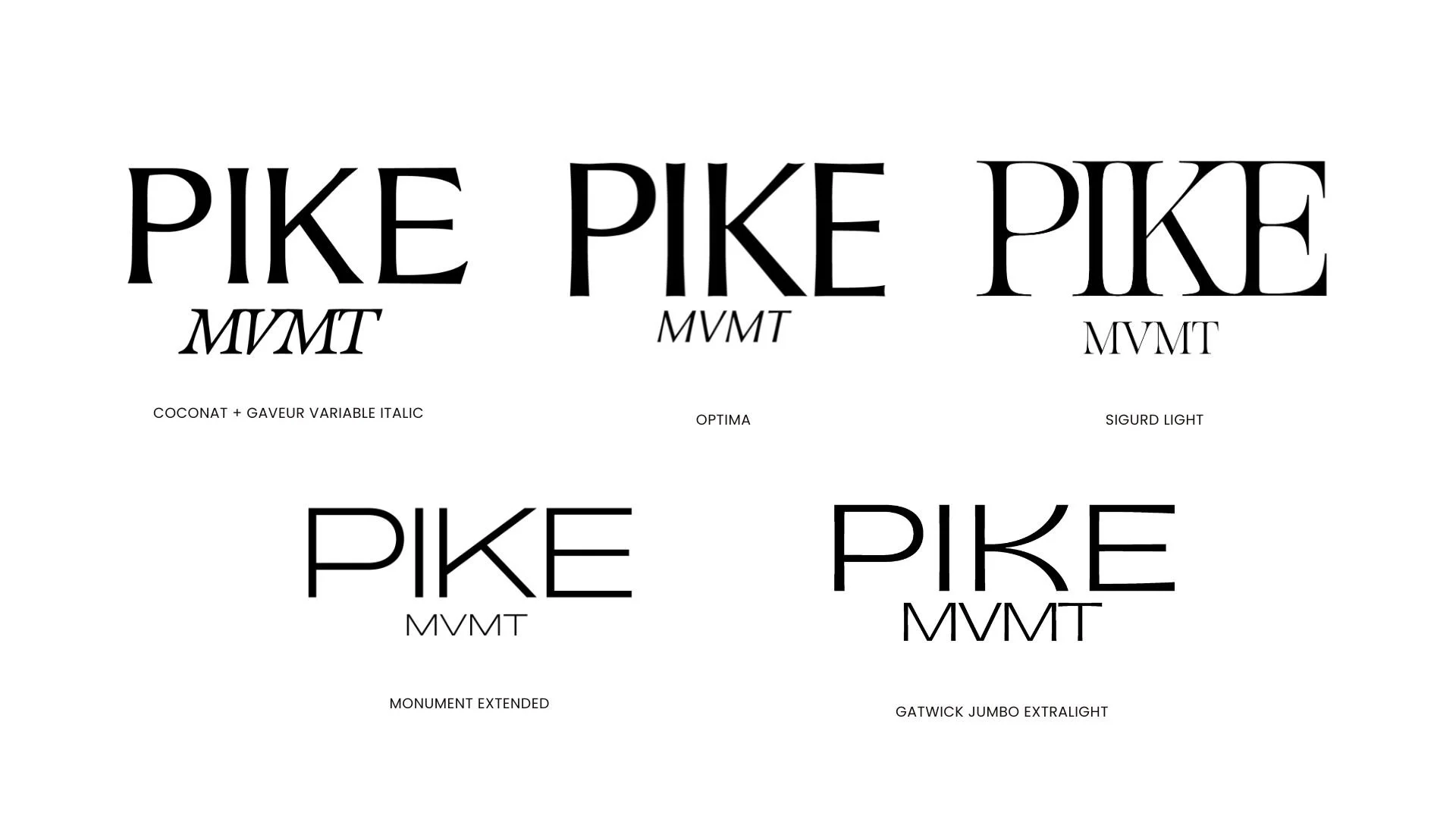 Across all three moodboard directions, over fifteen distinct typeface pairings were tested, ranging from Fuji Bold + Optima Italic to Monument Extended, Hatton Medium, Gelica, and Agenteur. Each combination was tested with the actual wordmark "PIKE MVMT" to evaluate rhythm, weight, and personality.