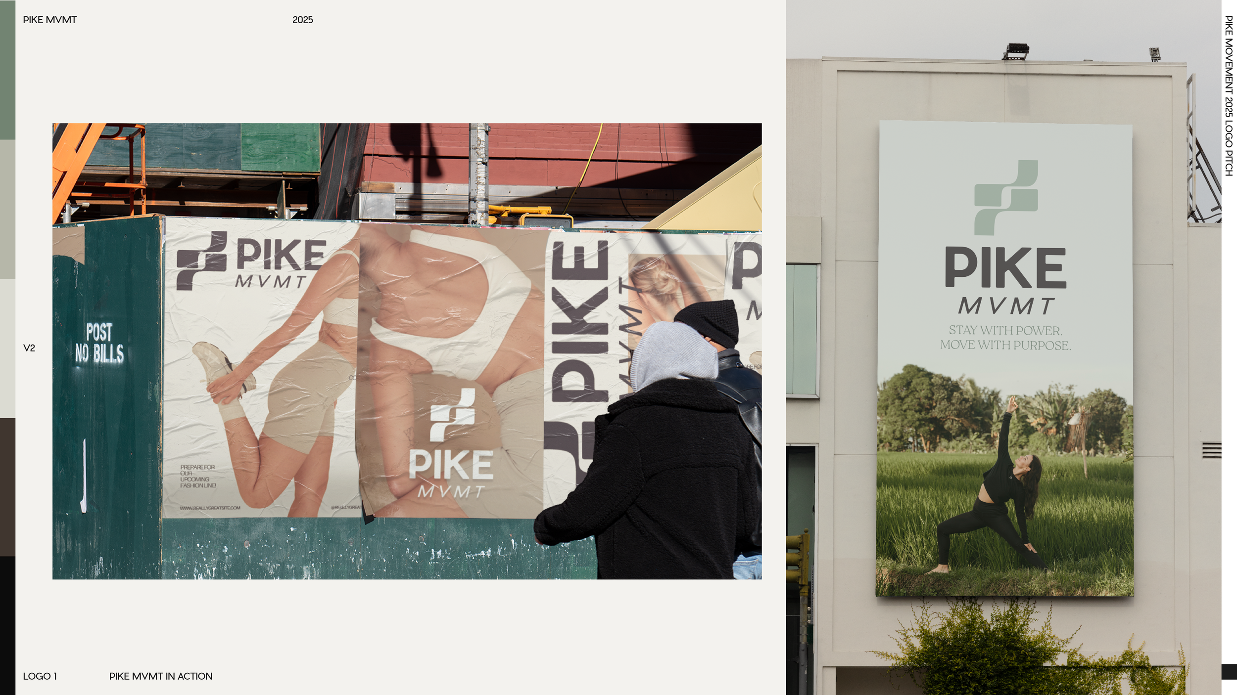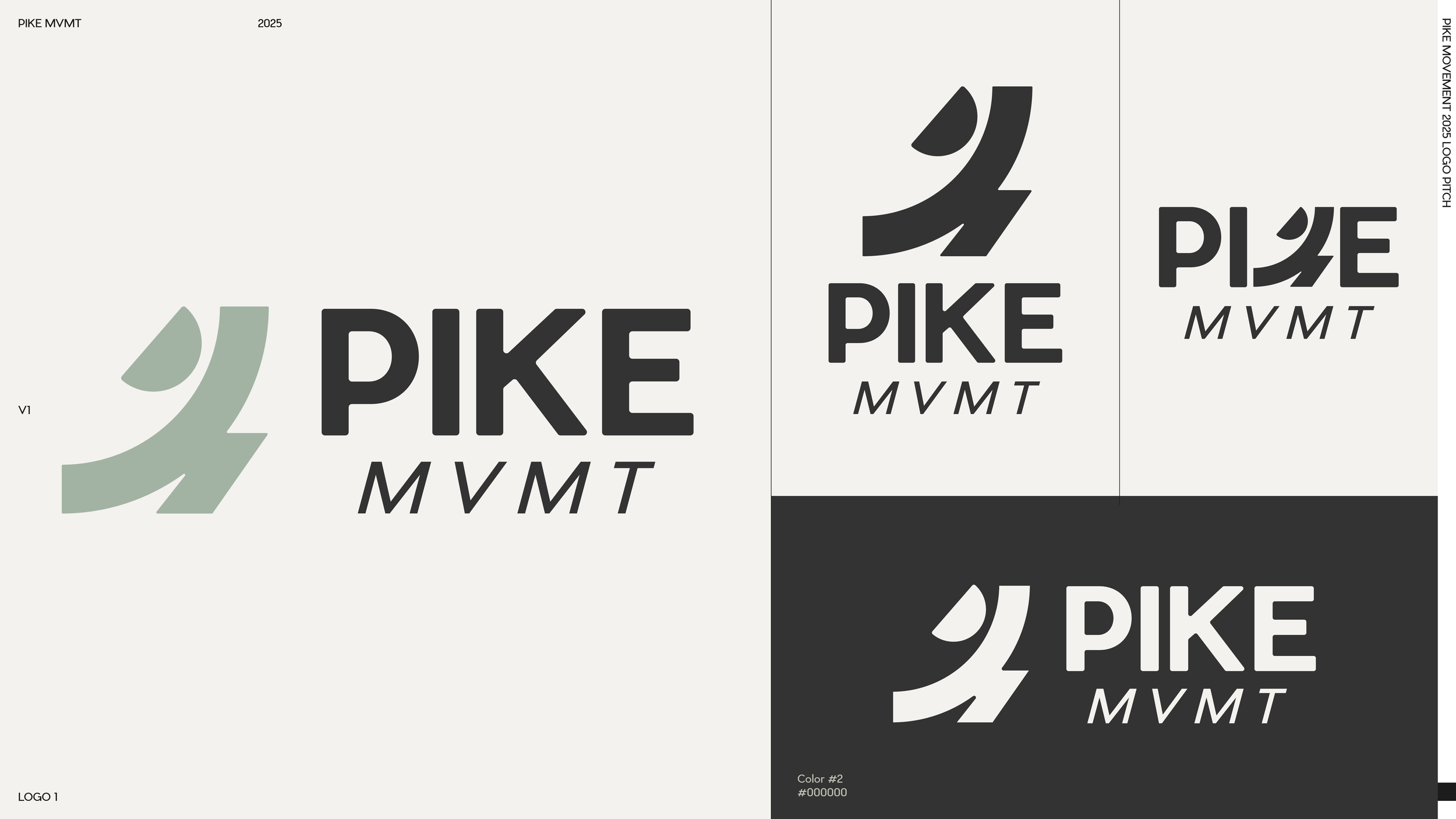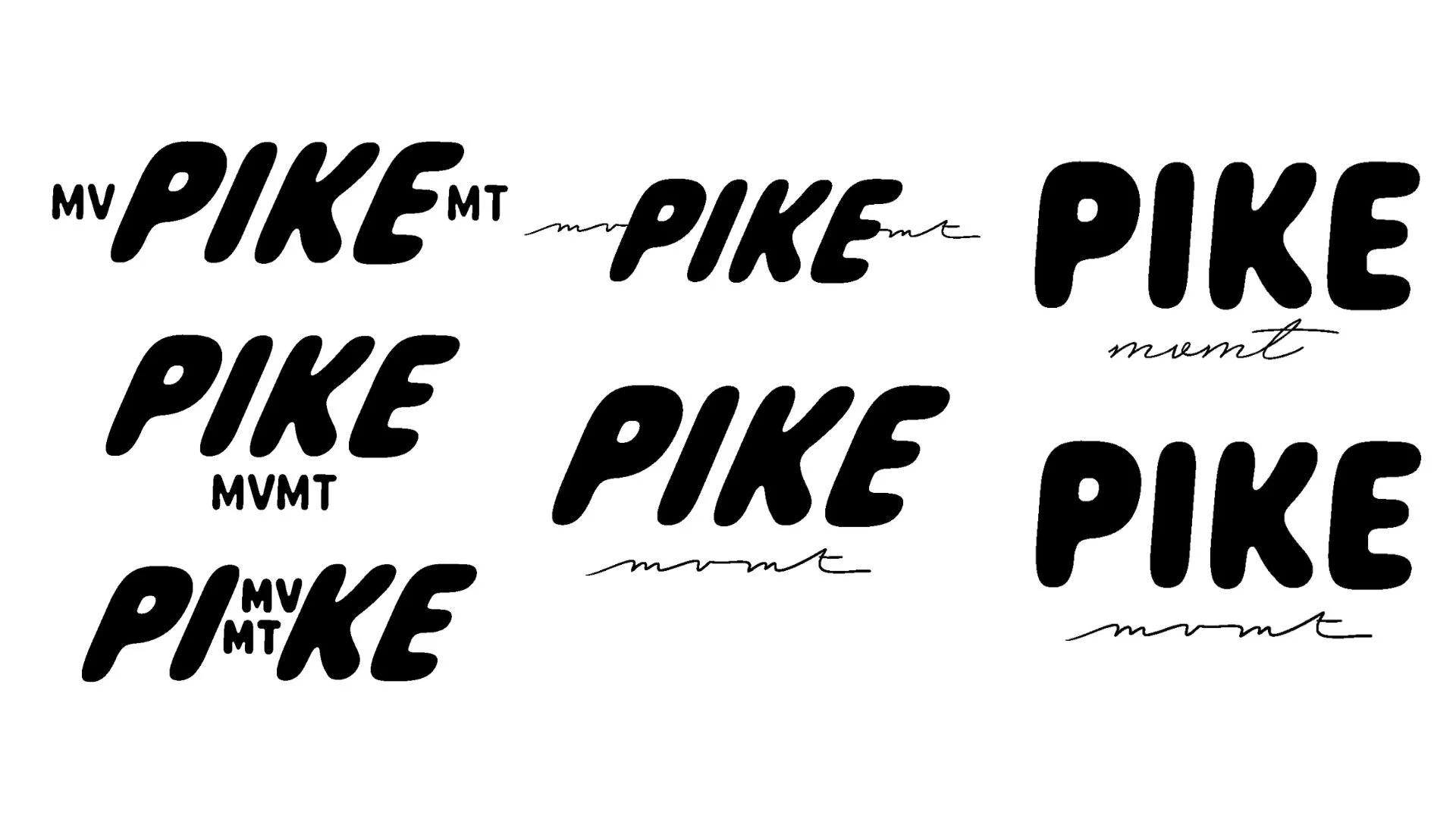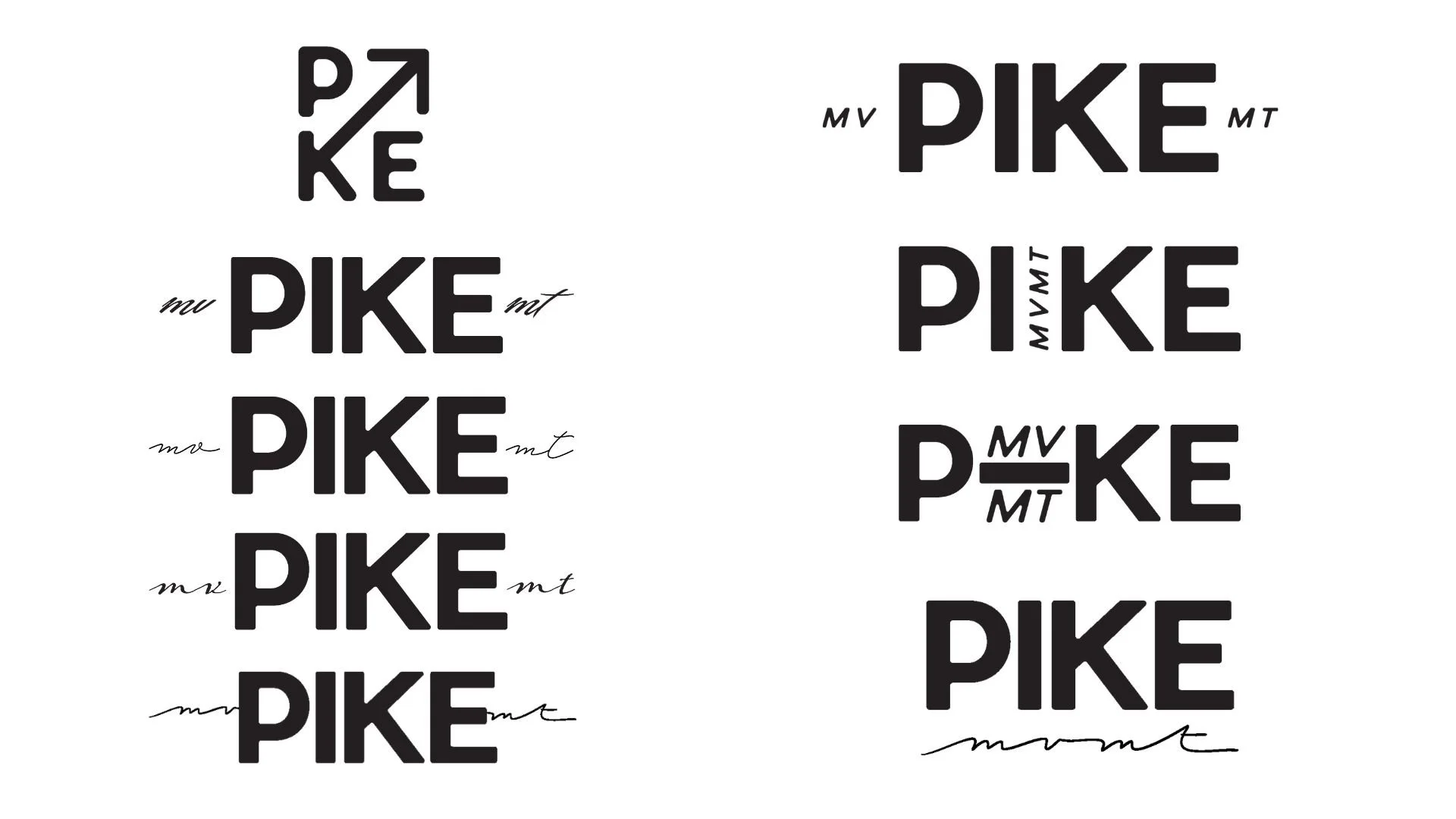 Pitches 3.0 and 4.0 refined the logo system in earnest. The "I" in PIKE was explored as a container for "MVMT," arrows and slashes were tested as dynamic substitutes for letterforms, and various script-weight relationships were explored. The final breakthrough came when the bold geometric wordmark was paired with a fluid, handwritten "mvmt", a typographic conversation between structure and movement.